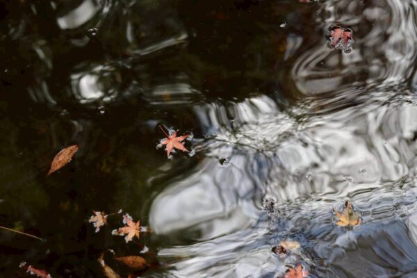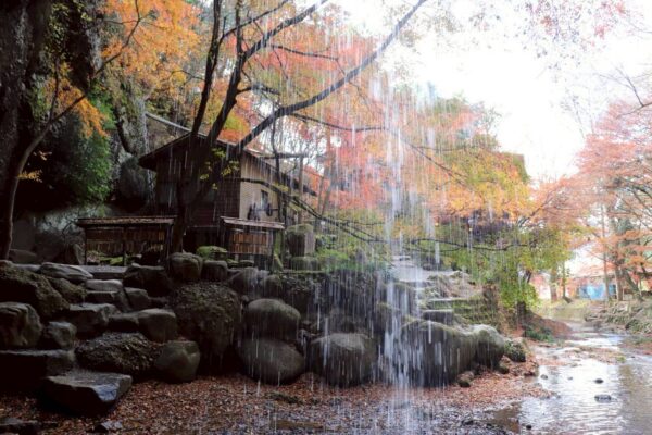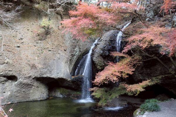 楓の木々に囲まれた、高さ17m・幅12mほどの静かな流れの滝です。
