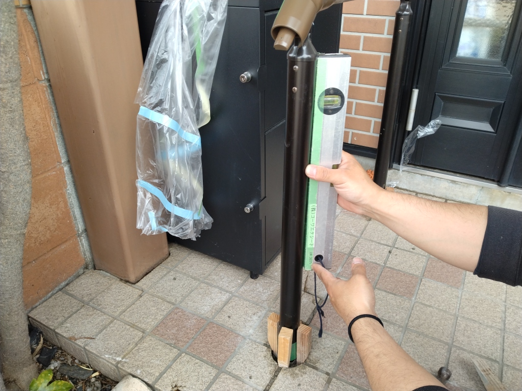 続いて、垂直・高さなどを確認しながら柱を仮固定していきます。